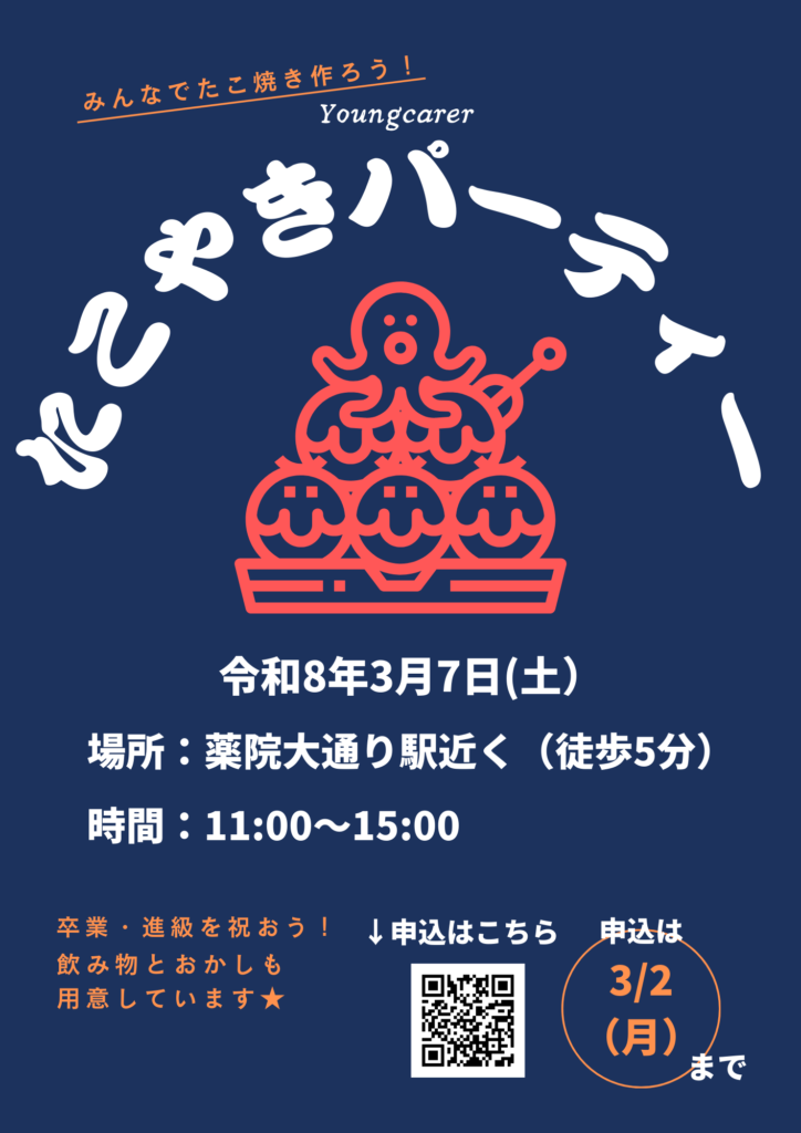 2026年2月17日 ヤングケアラーサロンを開催します 日時:2026年3月7日(土)11:00~15:00 ヤングケアラー同士で息抜きできる場のサロンを開催します。 今回は素敵な会場をお借りすることができました。 たこ焼きを作りながらみんなの進級・卒業をお祝いしましょう。 おしゃべりタイムのオンラインの参加のみもOKです。(14時~15時)参加対象:家族のケアを現在行っているヤングケアラー ※10 代や学生 お申込みはこちら(入力フォームが開きます)