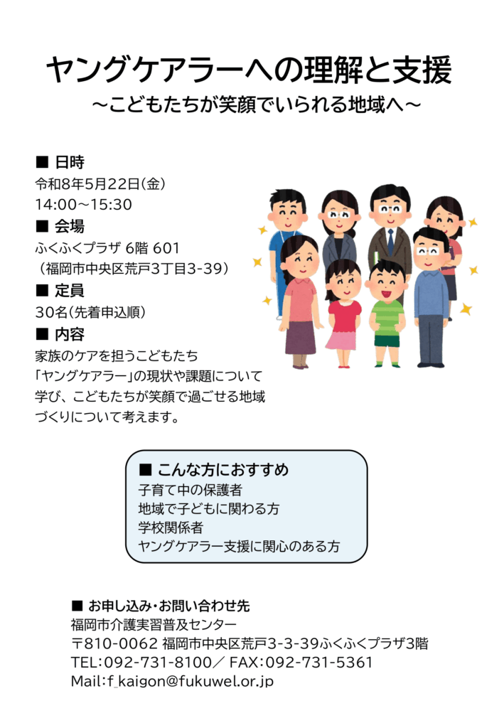 福岡市介護実習普及センター主催の市民向け介護講座にて、今年度「ヤングケアラーへの理解と支援」を担当することになりました。
